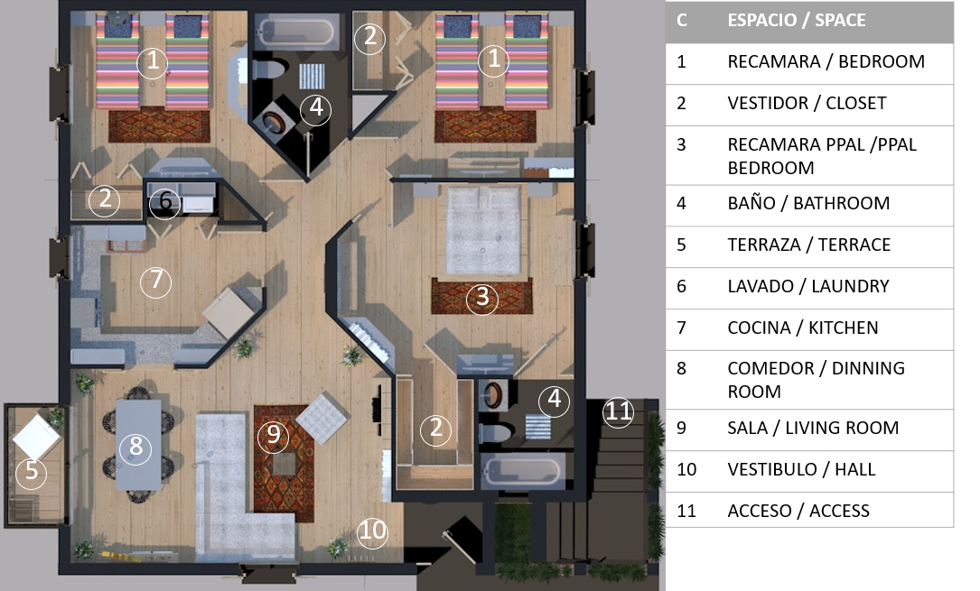 Tiene tres recámaras y dos baños, una cocina con área de lavado y terraza y una sala comedor. Si es en planta baja tiene una bodega bajo las escaleras y si es en planta alta tiene dobles alturas con el techo tradicional de zona lluviosa a dos aguas.
