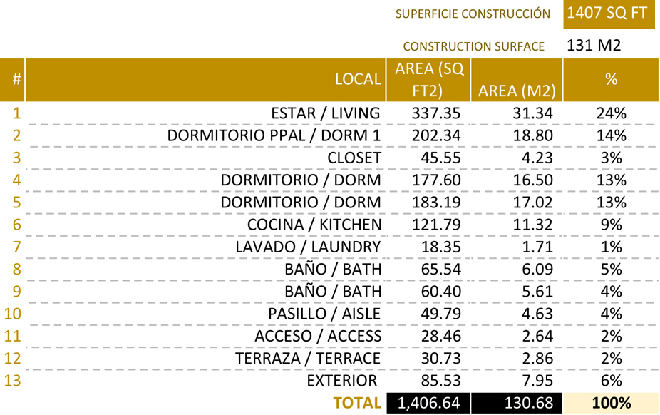 It has two bedrooms and three bathrooms, a kitchen with laundry area and terrace and a dining room. If it is on the ground floor, it has a cellar under the stairs and if it is on the top floor it has double heights with the traditional roof of rainy area with two waters.