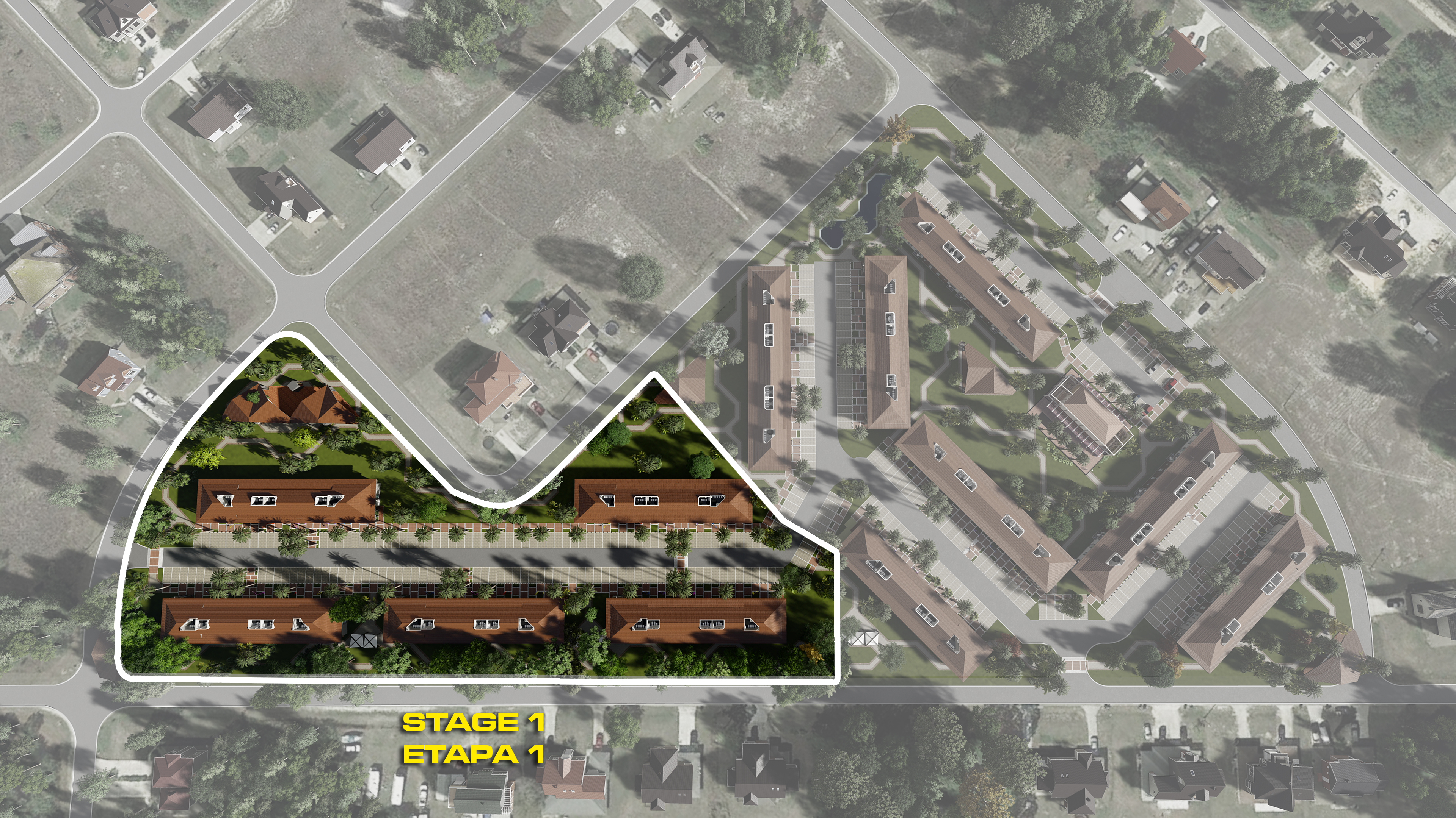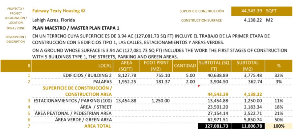 La primer Etapa de Fairway Texty Housing, se desarrolla en un terreno de 15945 m2 equivalentes a 3.94 acres. Es un conjunto privado de vivienda de 5 edificios tipo 2 de 2 niveles, con un total de 50 unidades vendibles (UV) de 2 y 3 recámaras.